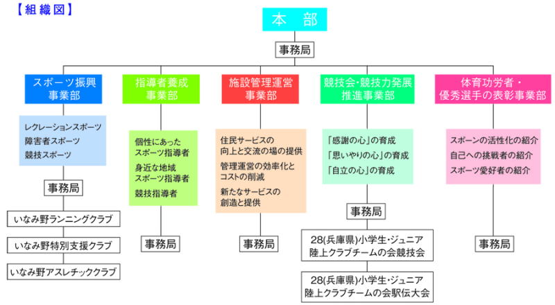 | 地域の住民に対して、スポーツ振興に事業を行い、全ての人が、心身ともに健康で、安心して暮らせる地域社会づくりに寄与することを目的とする。 |